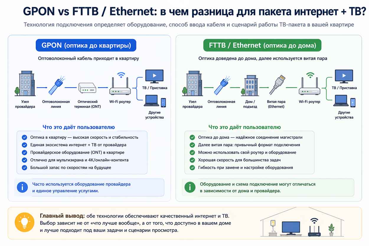 Если нужно глубже понять саму базу, полезно отдельно посмотреть, какие технологии подключения интернета существуют и чем они отличаются, а для бытового сравнения — FTTB и GPON: в чем разница и что лучше. Для пакета интернет + ТВ это не техническая формальность: от технологии зависит оборудование, способ ввода кабеля в квартиру, сценарий работы приставки и запас по скоростям внутри домашней сети.